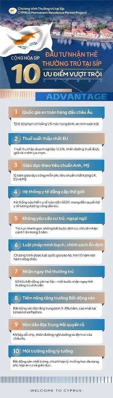 Trong bối cảnh toàn cầu hóa, quyền cư trú dài hạn tại EU trở thành tài sản giá trị bền vững mà các nhà đầu tư không thể bỏ lỡ. Cộng hòa Síp, thành viên EU, quốc gia an toàn hàng đầu Địa Trung Hải, mang đến cơ hội sở hữu thẻ thường trú vĩnh viễn chỉ với khoản đầu tư bất động sản chỉ từ 300.000 EUR.